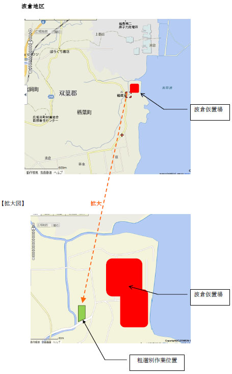 現地にて、災害廃棄物(津波がれき等)を粗選別のうえ、楢葉町波倉地区の災害廃棄物仮置場(住所:双葉郡楢葉町大字波倉字浜田)に搬出します。